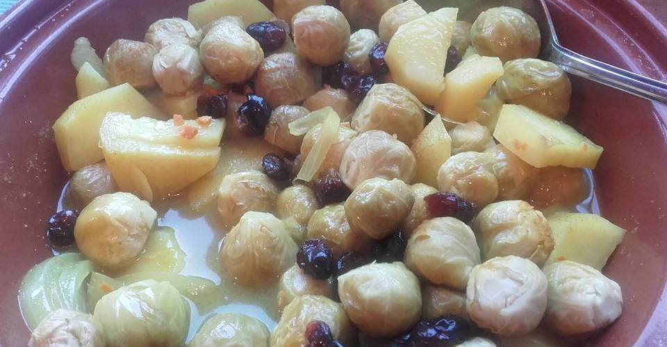 Schil de aardappels en snijd ze in blokjes. Maak de spruiten schoon. Snijd de ui in ringen. Verhit de olie en de kokos in de tajine en voeg de geplette knoflook, de kerrie en de fijngesneden kurkuma toe. Leg in dit mengsel de aardappelblokjes en de ui. Even goed doorroeren. Hierboven op leg je de spruiten en daarover strooi je de cranberries. Een beetje zout en eventueel een beetje peper erover. Voeg water toe tot de rand van de tajine. Laat ongeveer een half uur staan op een zacht vuur. Even controleren of de spruitjes gaar zijn en smullen maar!