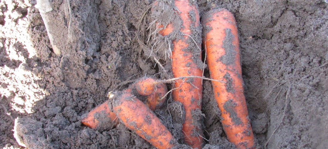 We gingen vanochtend dus even naar de tuin. Veel is er niet te doen, al moet er nog een heel stuk gespit worden. Verder staat alles een beetje stil, vooral nu er al een paar nachten  vorst was. De wortels en de bieten liggen veilig in de kuil te wachten tot we ze komen halen. Prei en boerenkool groeit gewoon door ondanks  de vorst en de witlof ligt waarschijnlijk te slapen; het zal nog wel een tijdje duren voor we die stronkjes uit  kunnen graven. Enfin, we hebben ruim twee kilo wortels uit de kuil gehaald (zie foto’s) en mee naar huis genomen. Ik heb een kilo gebruikt voor deze soep en de rest zal in de komende week door diverse recepten gaan. Ongetwijfeld zal ik er ook één of twee rauw naar binnen knagen want ik ben echt dol op  winterwortel!
